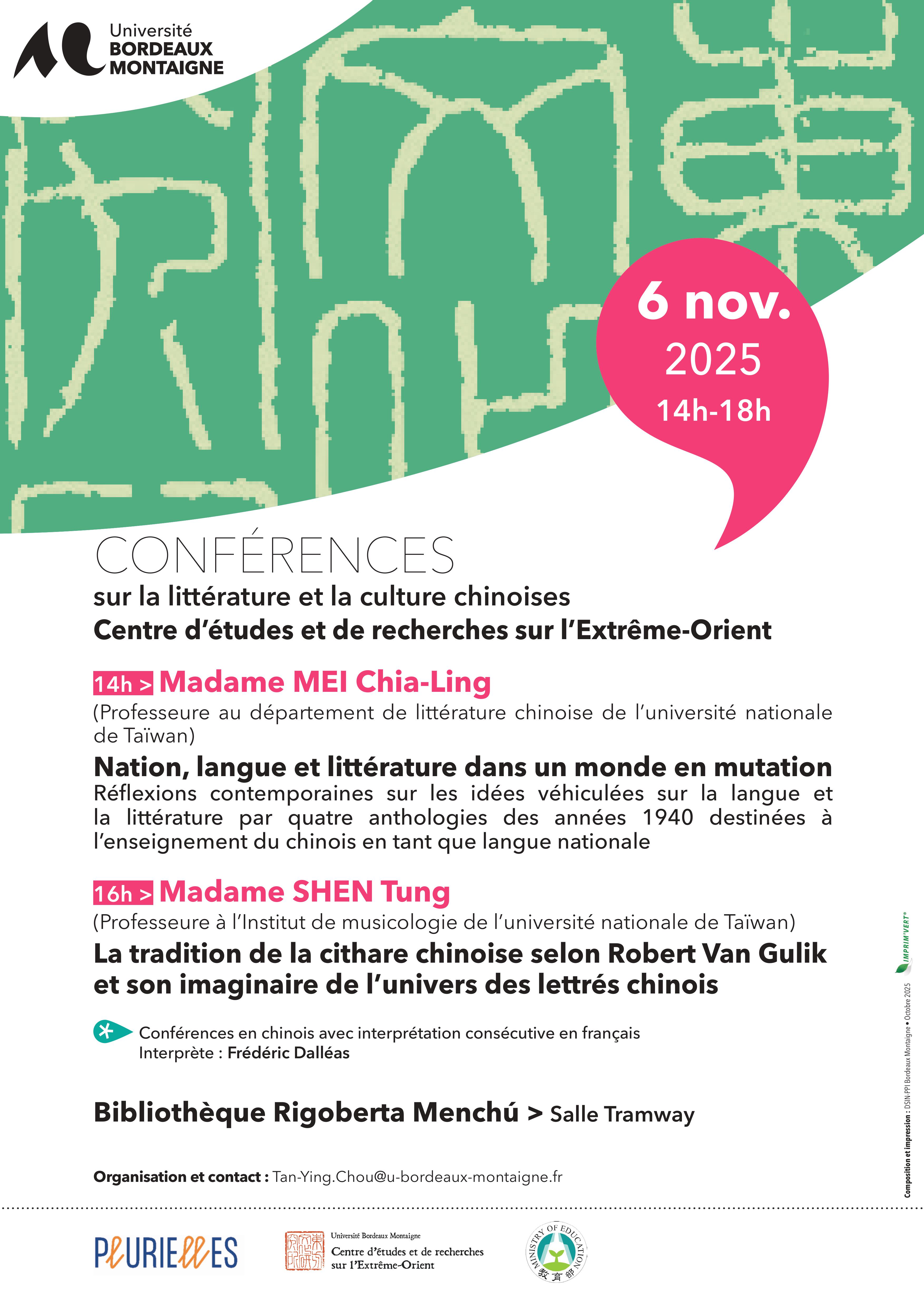 Conférences sur la littérature et la culture chinoisesLe jeudi 6 novembre 2025 14h - 18hBibliothèque Rigoberta Menchú (Salle Tramway)13h30 Accueil des participants14h Conférence de Mme MEI Chia-Ling, ...