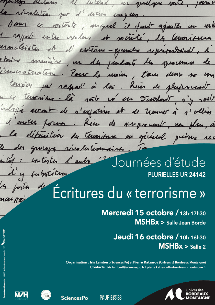 Il y a dès lors un intérêt à étudier le terrorisme à travers une variété de perspectives qui permettent non seulement d’explorer ce que le terme décrit, mais qui (est) décrit (et comment). C’est en ce sens que la question des « écritures du terrorisme » gagne en pertinence : s’y trouvent désignées les différentes manières par lesquelles le phénomène dit terroriste — comme une des manifestations de l’extrémisme violent aujourd’hui — produit, suscite de la lettre et du discours, que cela soit par ses acteurs, contre ses acteurs ou sur ses acteurs.