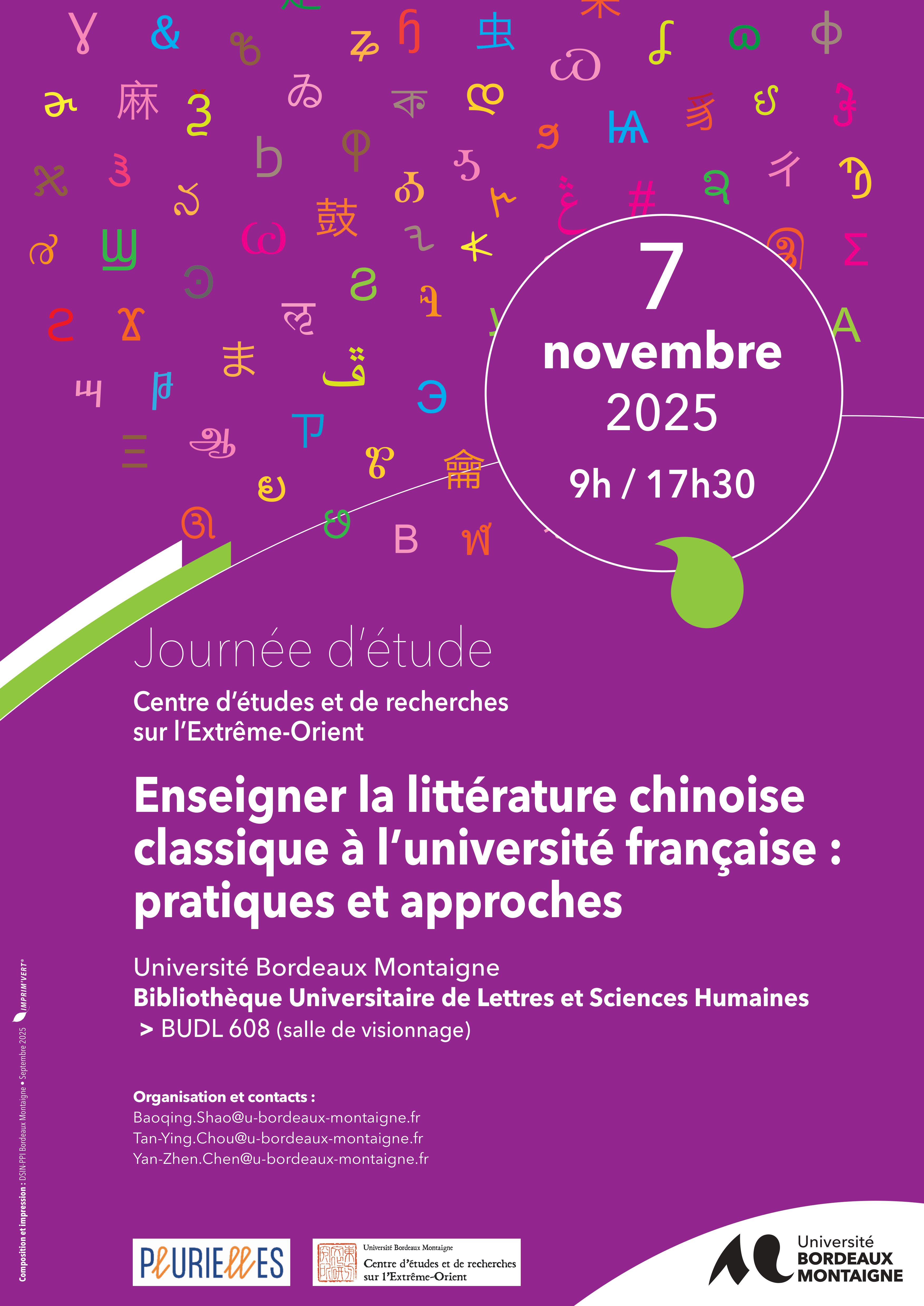 Pour faire suite à la journée d’étude de novembre 2024 consacrée à l’enseignement de la littérature chinoise moderne et contemporaine, le Centre d’études et de recherches sur l’Extrême-Orient (CEREO) et l’équipe PLURIELLES (UR 24142) organisent une nouvelle journée d’étude rassemblant des enseignants-chercheurs spécialistes de littérature chinoise classique et comparée.