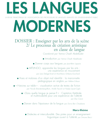 CHADLI ABDELKADER Yamna. Enseigner par les arts de la scène : le processus de création dans la salle de classe, Revue Les Langues modernes, n° 4/ 2023. Coordinatrice et autrice de l'introduction. Paris : APLV.
